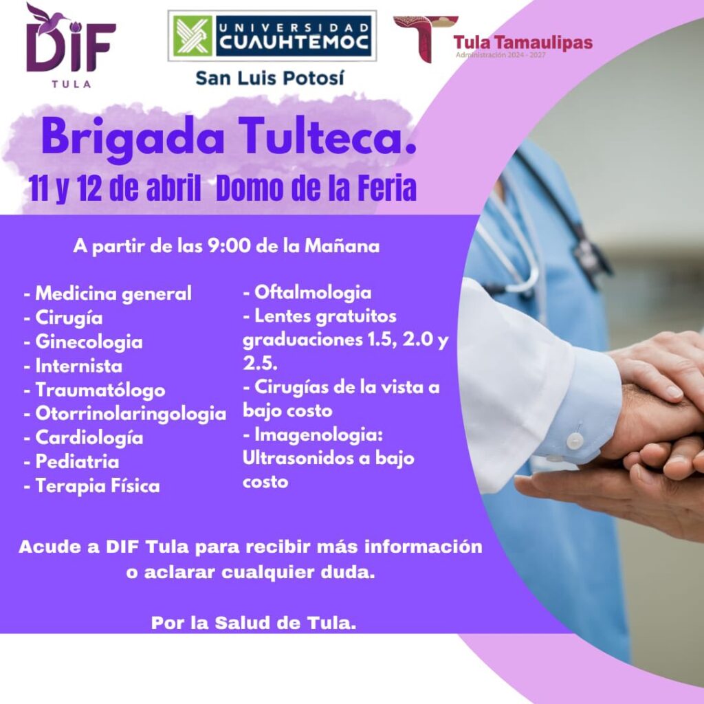 El Gobierno Municipal de Tula te invita a aprovechar la Brigada Tulteca, una jornada de salud pensada para el bienestar de todas las familias tultecas, en coordinación con el DIF TULA y alumnos de la Universidad Cuauhtémoc.
